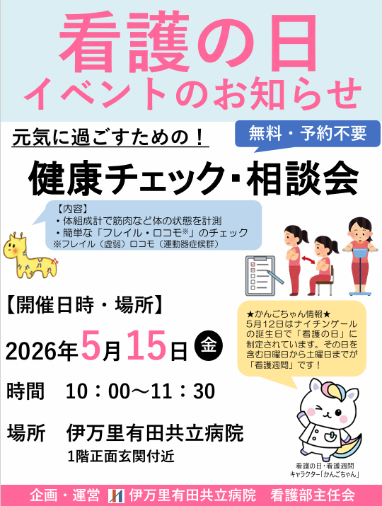 日時:2026年5月15日(金)10:00~11:30場所:伊万里有田共立病院 1階正面玄関付近
