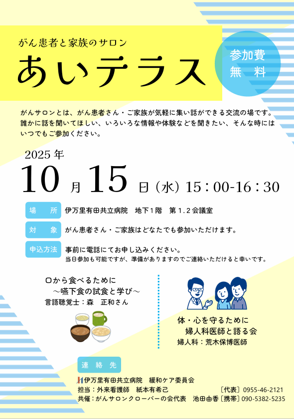 【患者さん向け】がん患者と家族のサロン(あいテラス)開催のご案内 10/15(水)開催