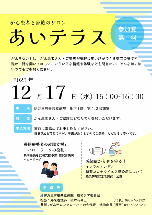 日時 : 2025年12月17日(水)15:00~16:30場所 : 伊万里有田共立病院 地下1階 第1・2会議室参加費: 無料対象 : がん患者さん・ご家族はどなたでも参加いただけます。